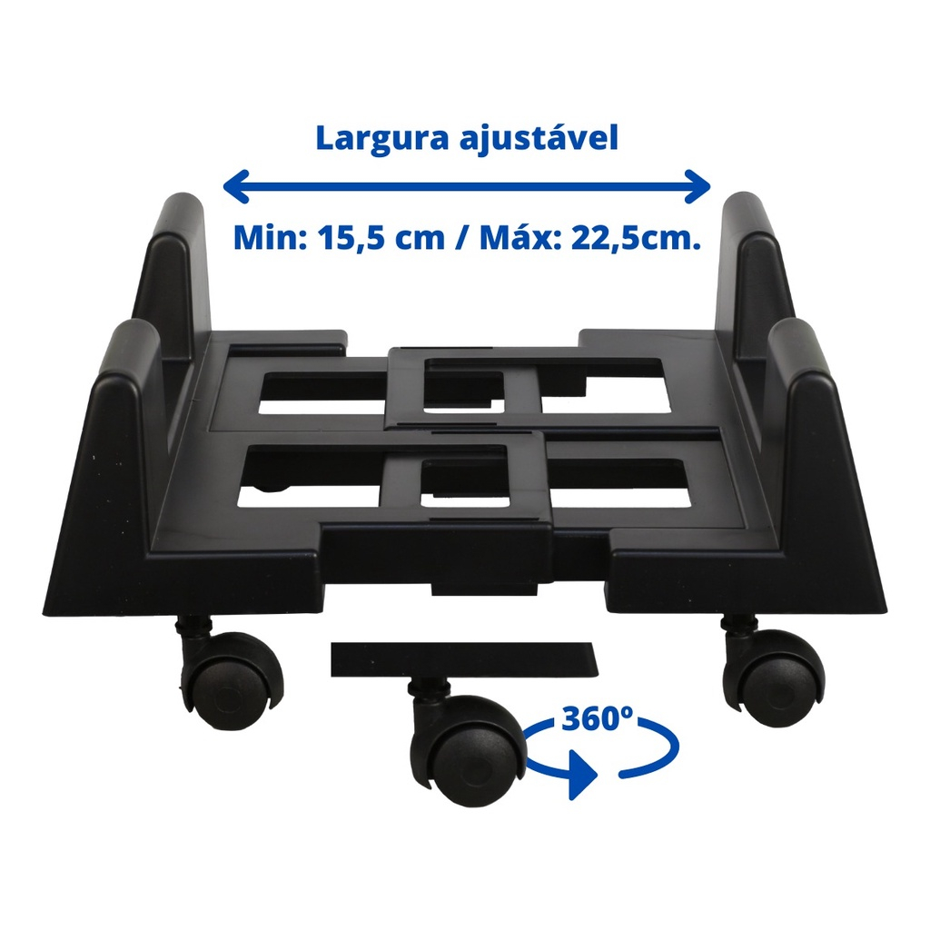Com design robusto e resistente, nosso suporte para CPU oferece uma proteção sólida para o seu computador. Fabricado em plástico de alto impacto, ele evita danos causados por quedas acidentais, batidas ou arranhões. As rodas resistentes e de alta qualidade permitem que você mova a CPU com facilidade, sem esforço.